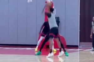体育资讯2月19日讯 美媒露天看台晒出了火箭全明星后首次训练画面,写道:“杜兰特成功防下小贾巴里。”