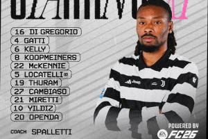 尤文首发:16-迪格雷戈里奥、4-加蒂、6-凯利、27-坎比亚索、5-洛卡特利、8-库普梅纳斯、19-凯夫伦·图拉姆、22-麦肯尼、21-米雷蒂、10-伊尔迪兹、20-奥蓬达