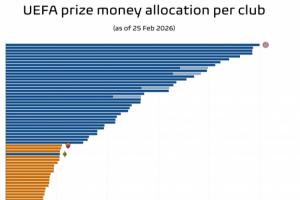 体育资讯02月25日讯 专业数据媒体Football Meets Data统计了目前三级欧战奖金情况,其中拜仁9980万欧最多,欧联杯最多的罗马仅比欧冠最少的阿拉木图凯拉特多90万欧。