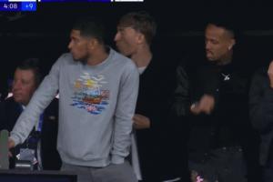 补时第4分钟,镜头给到看台上的皇马多名球员。米利唐和贝林专注看比赛,赫伊森吃着什么东西。